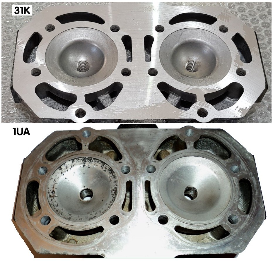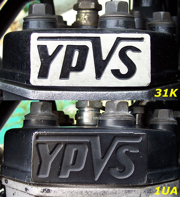 In Europe, many of '86 to '91 RD350F2 (1WT and 3DH1 model) were assembled by YAMAHA with old '83 or '84 RD350LC2 (31K model) instead of new heads stamped "1UA". 31K heads have a spherical squish and 1UA tronconical squish. Swiss 1WU engine has the 1UA heads |