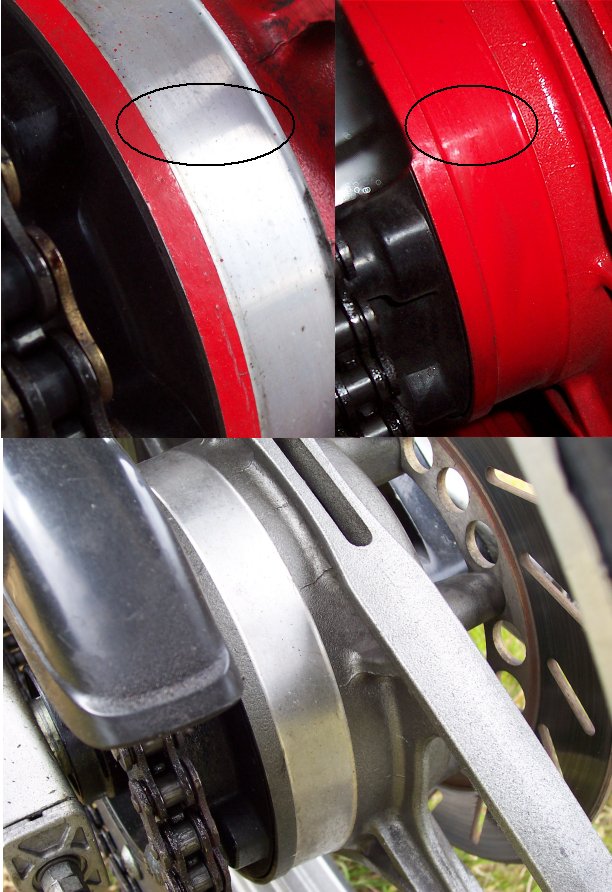 Machined surface on rear wheels from since '86 on RD350N2 / F2 and equivalent RZs. This surface can be painted or not. This machined surface could be used to hold the wheel during machining of the wheel. |